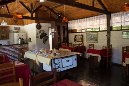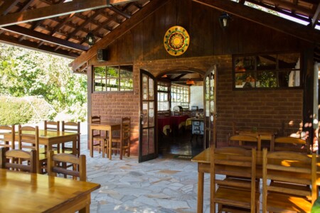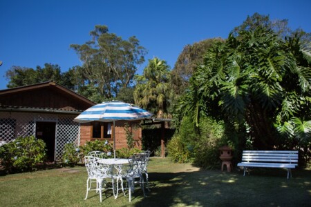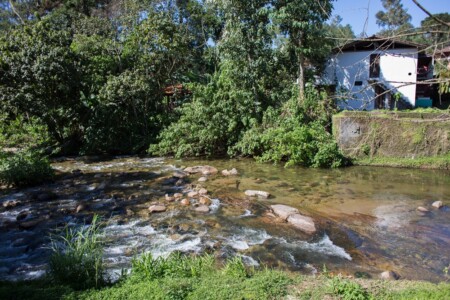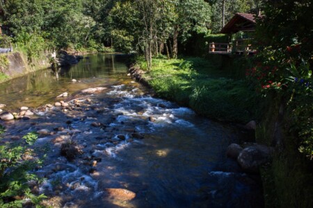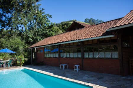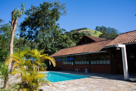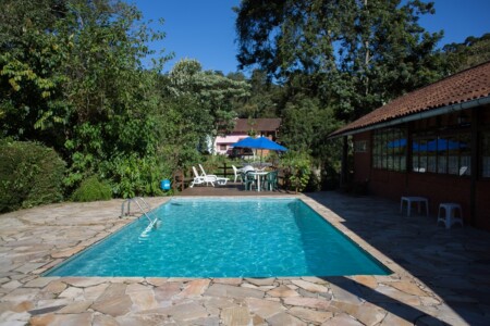 Mas não é só isso! O grande destaque da nossa pousada é o rio que serpenteia pelo fundo, criando um cenário idílico. É possível refrescar-se nas suas águas cristalinas e, ao mesmo tempo, deleitar-se com os sons suaves da natureza ao nosso redor. É uma experiência que proporciona uma sensação única de conexão com o ambiente natural.