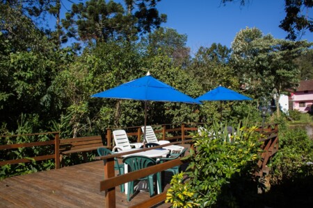 A área externa da nossa encantadora pousada é um verdadeiro refúgio natural. Com uma piscina convidativa e um espaçoso deck de madeira, oferecemos aos nossos hóspedes um ambiente perfeito para relaxar e desfrutar do sol.
